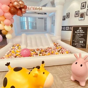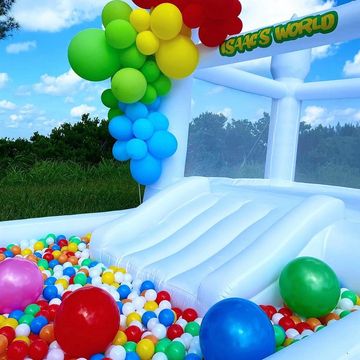 Just imagine your next event pictures with a White Bounce House with Ball Pit decorated with Balloons of your decorations colors! That will be amazing right!